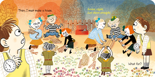 친구들이 그 아래를 지나가는 협동 놀이를 해요. -